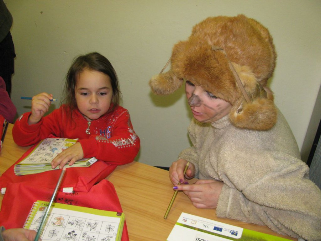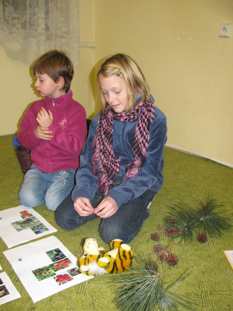 Po prohlédnutí literatury a obrázků rozdáme dětem pracovní listy s informací, co mají dělat. Například: „Sovík ….. s medvídětem …… mají pro vás připravené obrázky lesních plodů a hub, které lze v lese najít, ale ztratily se jim z obrázků barvičky, dokážete správně vybarvit obrázky?“